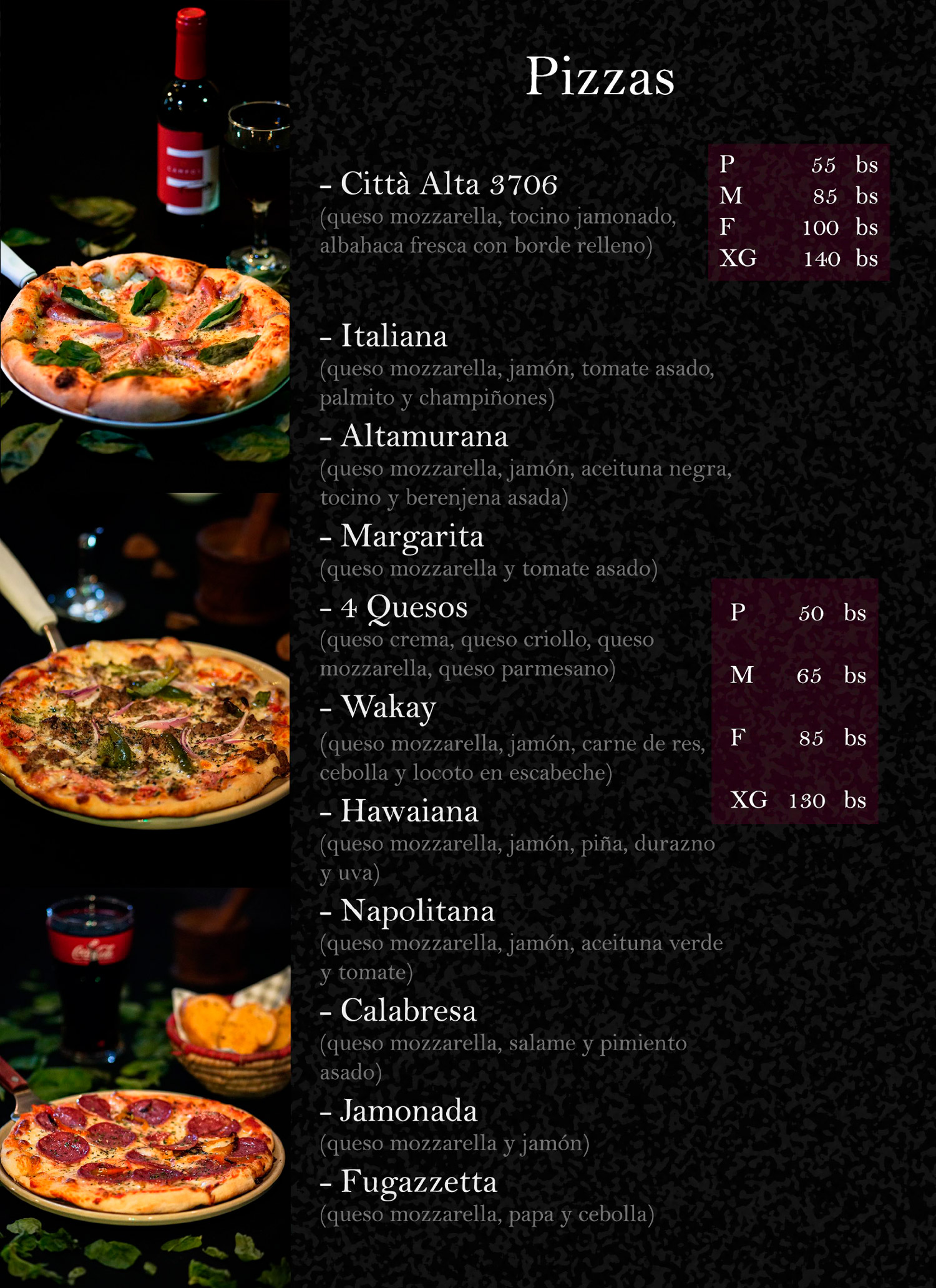 Disfruta del mejor sabor al estilo italiano en Oruro. Especialidad en pizzas y pastas. Pizzería Citta Alta.